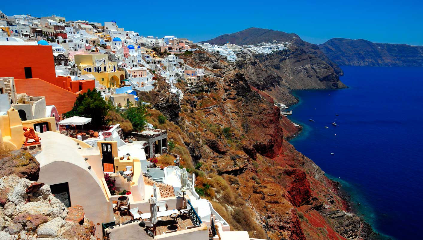 A la llegada al puerto de Santorini, entre bellísimos paisajes vamos a Oia, sin duda la más espectacular población de la isla, callecitas blancas llenas de vida, inmensas vistas sobre acantilados, restos de castillo y molinos de viento.