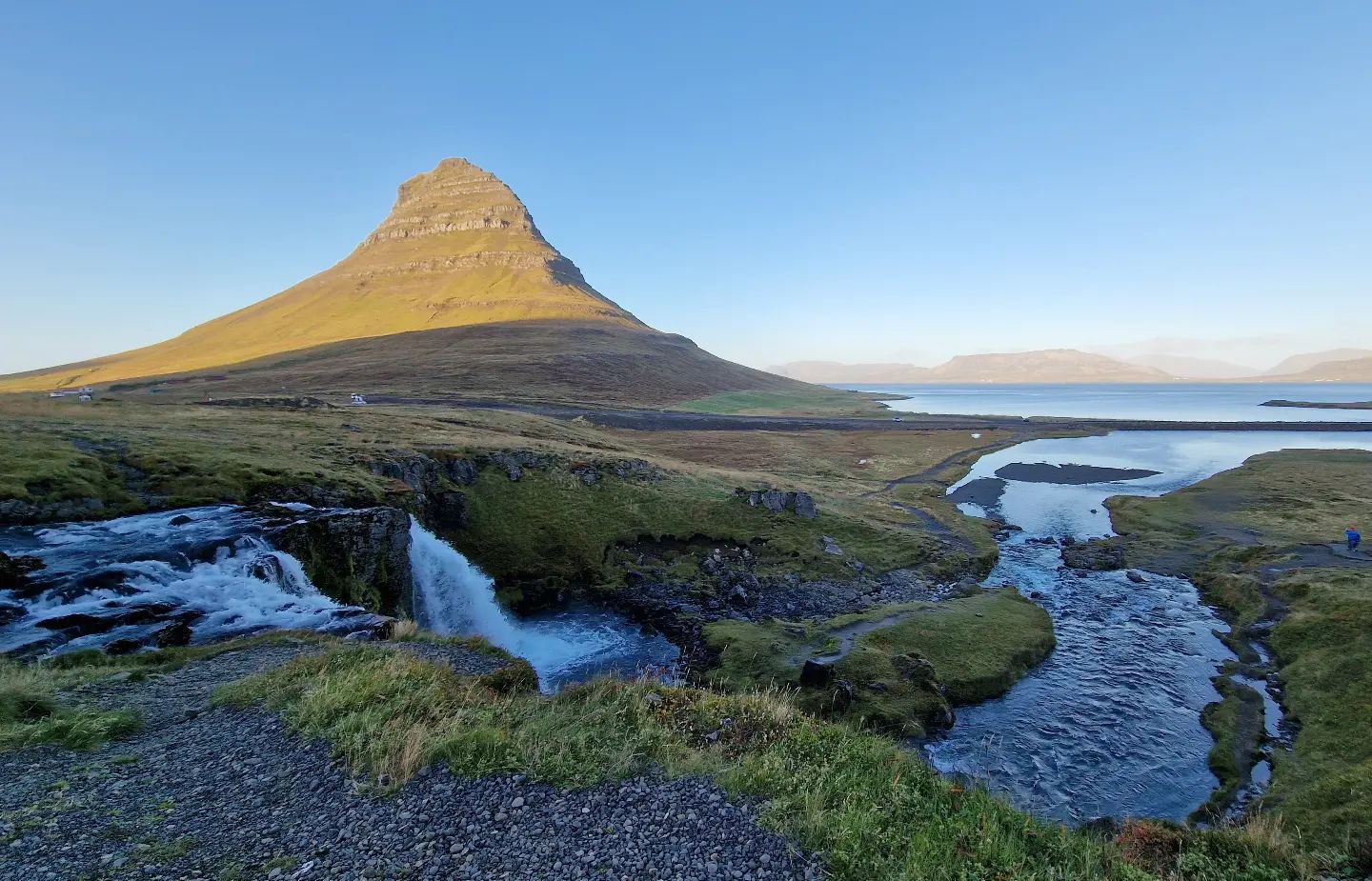 En el pueblo de Grundarfjörður encontraremos la montaña más fotografiada de la isla, el volcán Kirkjuffel, acompañado de las pequeñas, pero no por eso menos hermosas, cascadas de Kirkjufellsfoss.