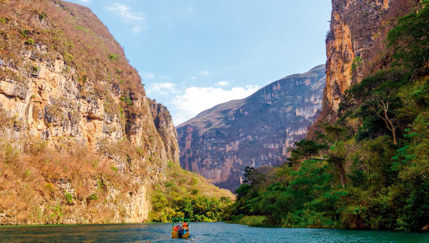 Conocemos el Cañón del Sumidero, en lancha navegamos en este impresionante cañón de casi 1 km de profundidad y 14 km de longitud.